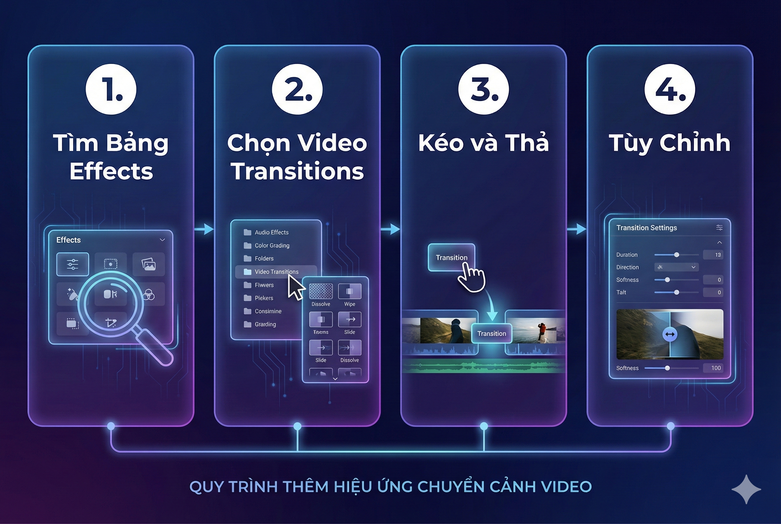 | Thời Lượng Không Phù Hợp | Một hiệu ứng chuyển cảnh quá dài có thể làm chậm nhịp độ video, trong khi quá ngắn sẽ gây cảm giác đột ngột. | Điều chỉnh thời lượng của hiệu ứng để phù hợp với nhịp điệu của âm nhạc và nội dung. |