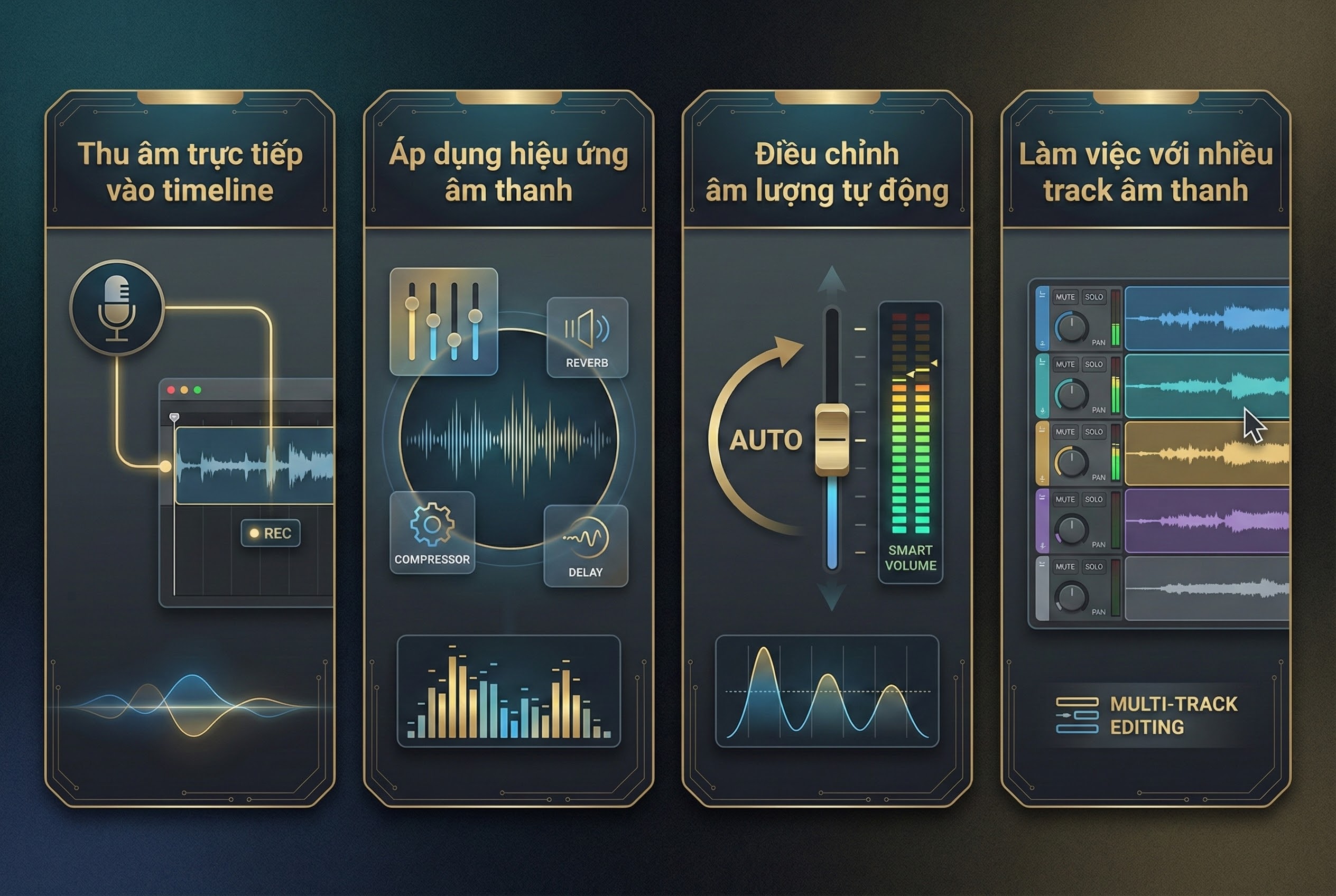 - Áp dụng hiệu ứng âm thanh: Khử nhiễu, cân bằng tần số (EQ), nén tiếng (Compressor) để giọng nói ấm và rõ hơn.