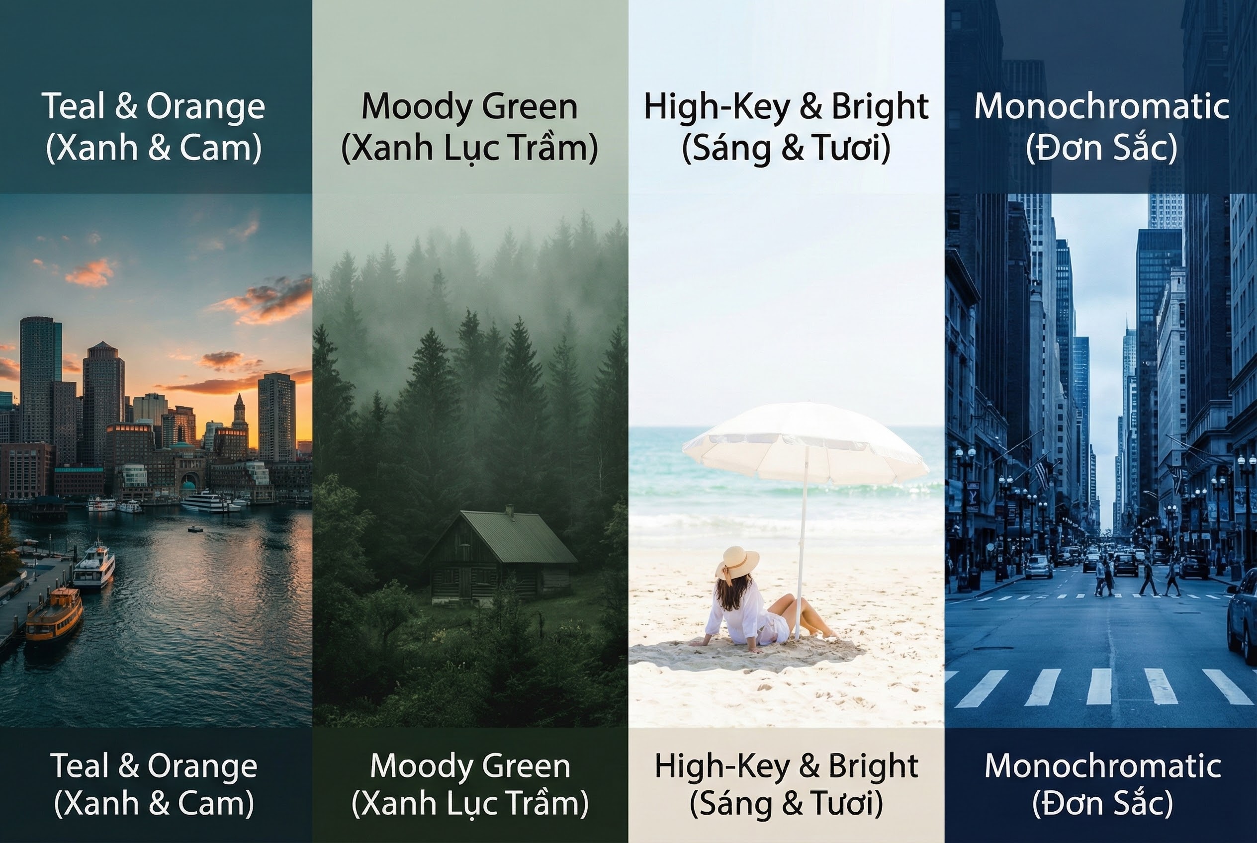 • Teal & Orange (Xanh & Cam): Tông màu điện ảnh kinh điển, tạo ra sự tương phản mạnh mẽ giữa tông màu da (cam) và môi trường (xanh). Rất phù hợp cho các video du lịch, hành động, hoặc các sản phẩm công nghệ, tạo cảm giác hiện đại, năng động.
