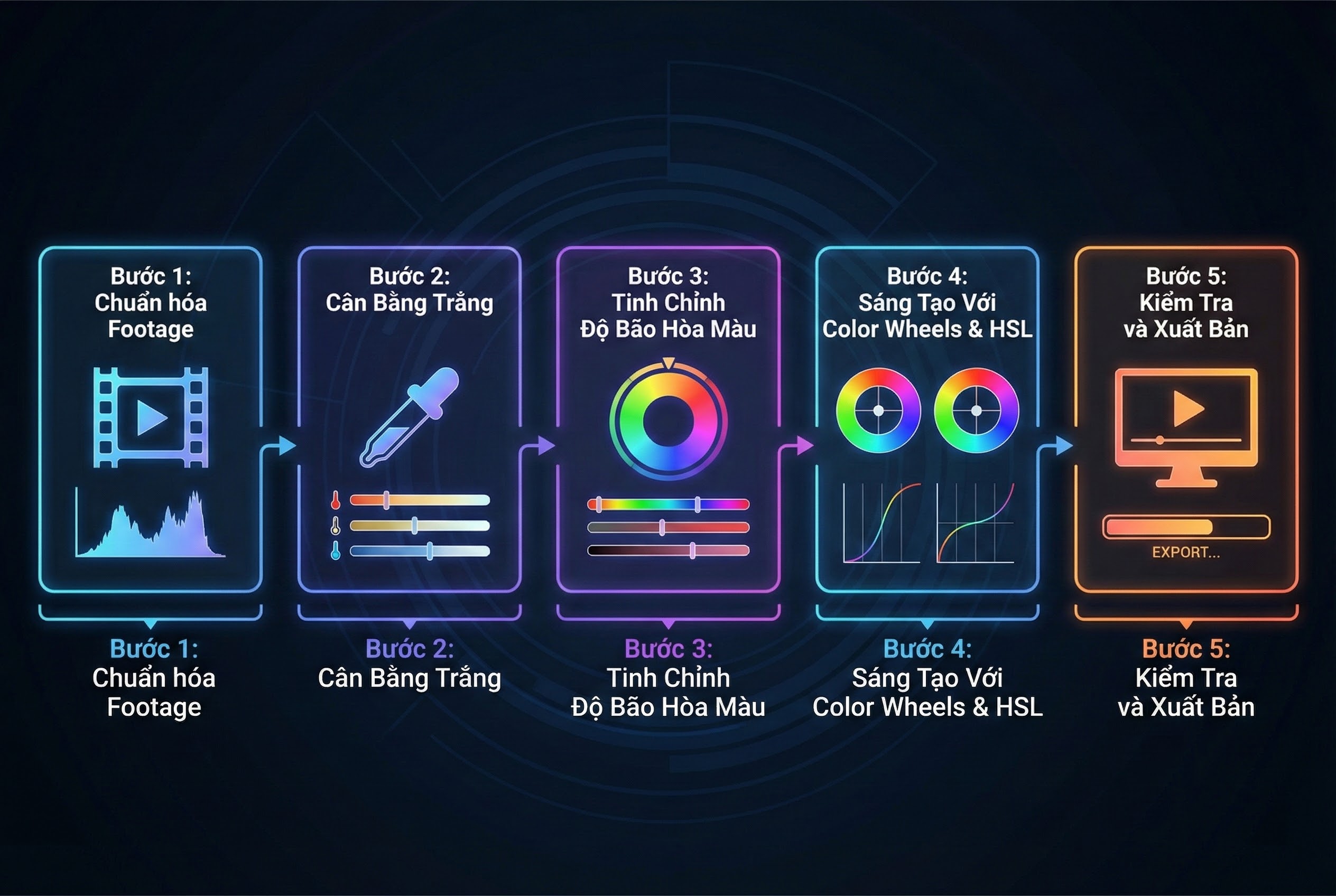 Để biến lý thuyết thành kết quả thực chiến, bạn cần một quy trình rõ ràng. Dưới đây là hệ thống 5 bước mà bạn có thể áp dụng ngay lập tức cho các dự án video của mình, từ việc chỉnh độ sáng video đến việc tạo ra một phong cách màu hoàn chỉnh.
