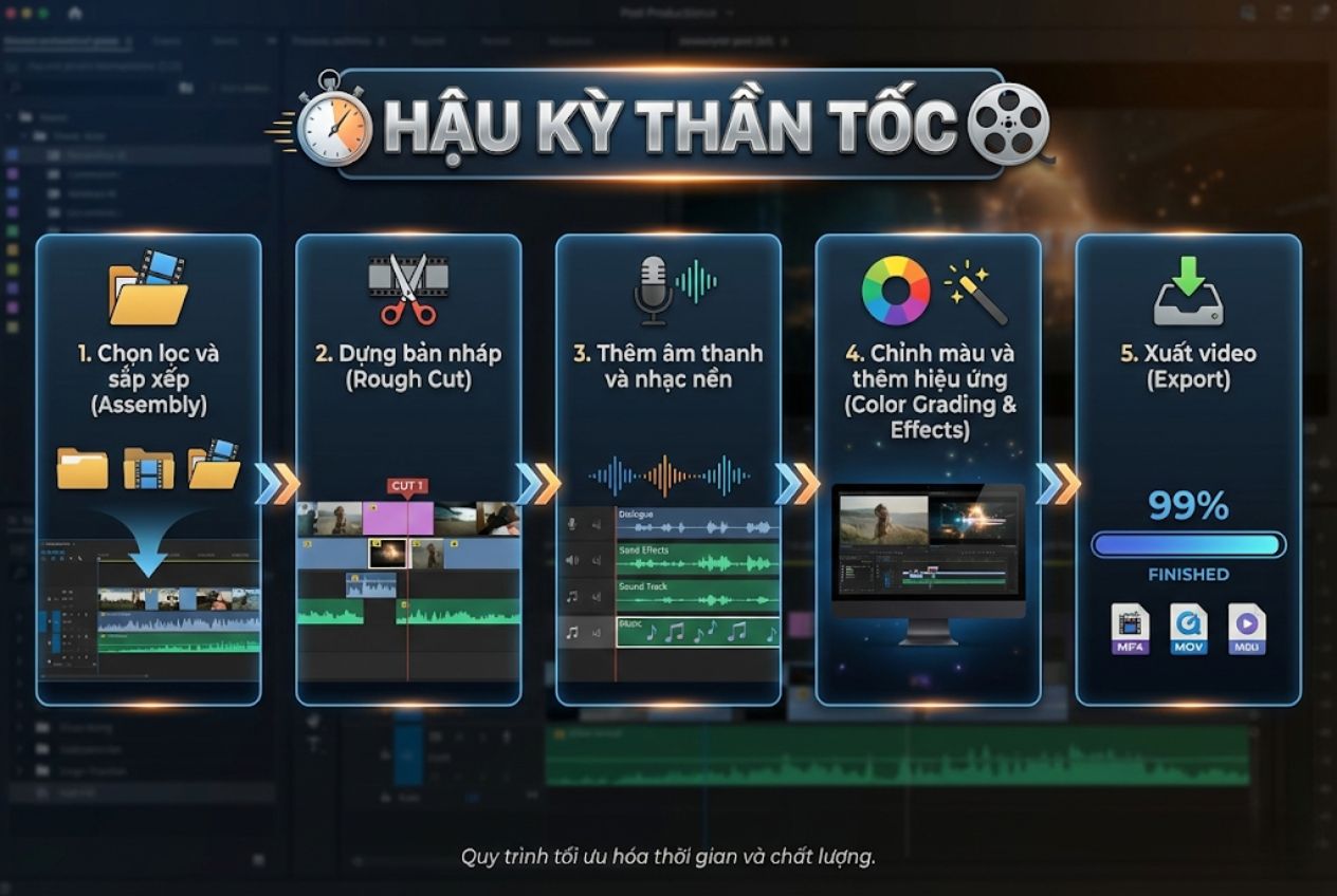 Hậu kỳ hay edit video là quá trình sắp xếp các cảnh quay thô thành một câu chuyện hoàn chỉnh. Đây cũng là giai đoạn khiến nhiều người nản lòng nhất. Tuy nhiên, với một quy trình bài bản và sự hỗ trợ của công nghệ, bạn hoàn toàn có thể tối ưu hóa giai đoạn này. Quy trình biên tập video cơ bản bao gồm: