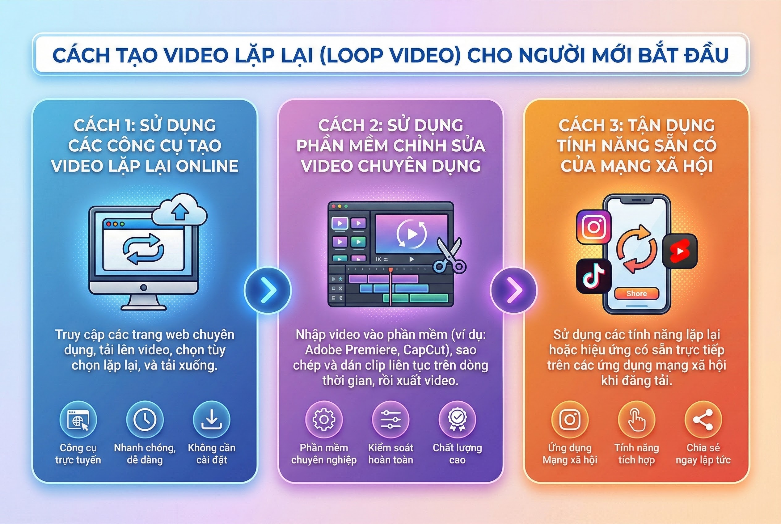 Để giúp các chủ doanh nghiệp và đội ngũ marketing có thể ngay lập tức áp dụng kỹ thuật này, Mentor Nguyễn Tất Kiểm đã hệ thống hóa 3 phương pháp tạo video vòng lặp từ cơ bản đến nâng cao. Tùy thuộc vào nguồn lực và mục tiêu, bạn có thể lựa chọn cách thức phù hợp nhất để tối ưu hóa quy trình sản xuất nội dung của mình.