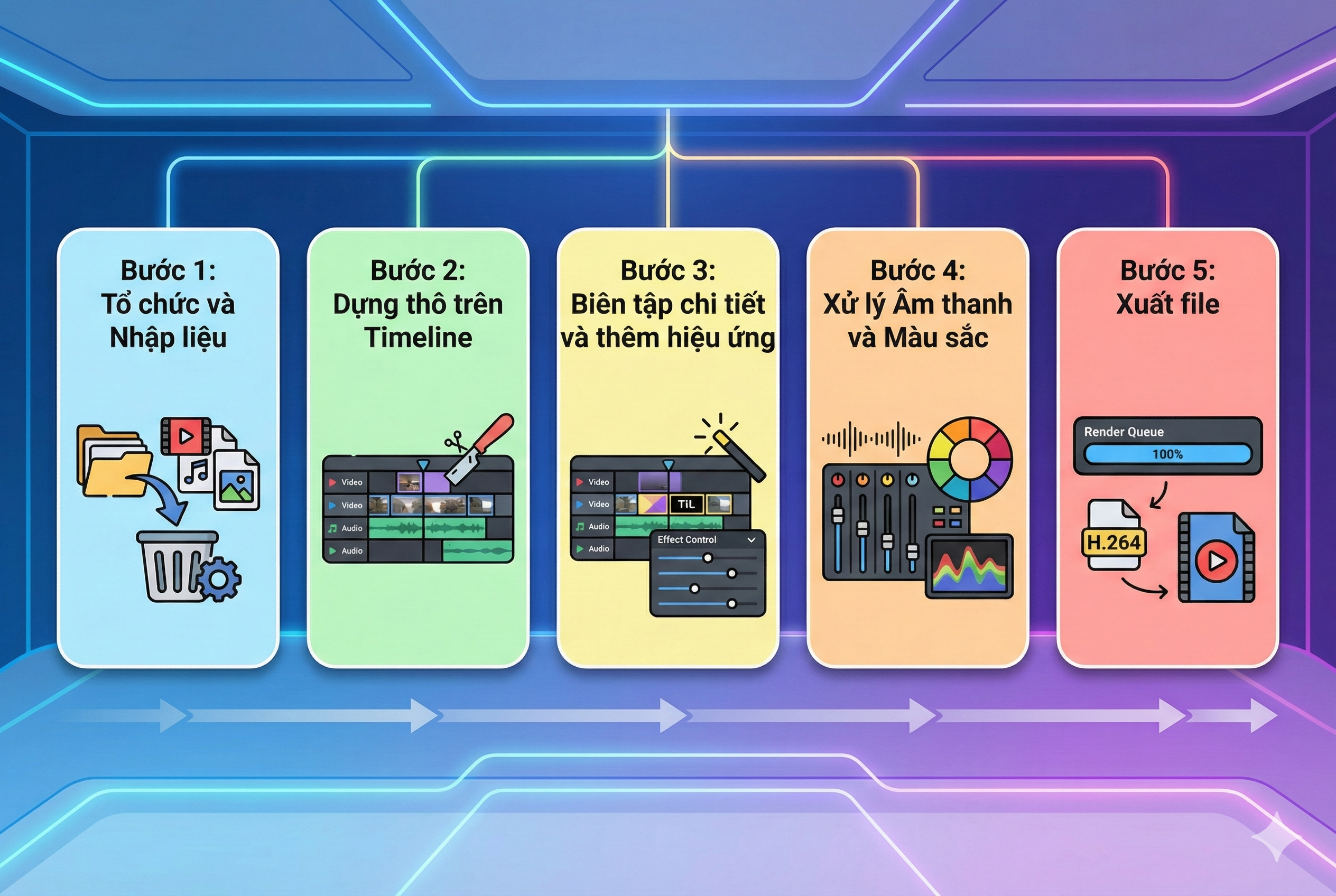 Làm chủ một phần mềm mạnh mẽ đòi hỏi một quy trình có hệ thống. Dưới đây là lộ trình 5 bước mà chúng tôi đã đúc kết để giúp hàng ngàn học viên bắt đầu hành trình làm video chuyên nghiệp với Premiere.