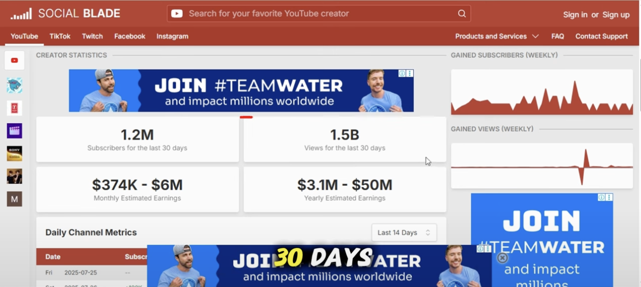 Ví dụ: Đây là một kênh YouTube đã đăng tải chỉ 630 video và có hơn 22 triệu người đăng ký. Một trong những video của họ đã đạt hơn 226 triệu lượt xem. Đúng vậy, bạn không nghe nhầm đâu, 226 triệu lượt xem. Theo SocialBlade, kênh này có khoảng 1,5 tỷ lượt xem trong 30 ngày qua. Thu nhập hàng tháng của họ dao động từ 375K đến 6 triệu USD. Ngay cả ở mức thấp nhất, họ kiếm được khoảng 43.000 USD mỗi ngày.